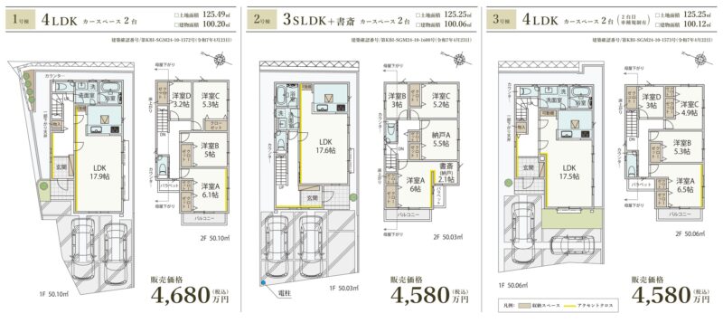 | 敷地全体面積 | 120.25~140.65m² | 延べ床面積 | 100.06~105.62m² |